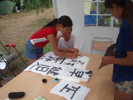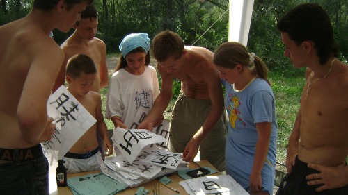 Обычно после обеда нас собирал Евгений Николаевич, и мы занимались сёдо. Сёдо – это японская каллиграфия, которая требует не столько правильности написания, сколько сосредоточенности, концентрации мысли и искренности выражения своих чувств. Нам это занятие очень нравилось, мы с большим старанием готовили чернила, раскладывали рисовую бумагу, а потом наносили на нее кисточкой линии, из которых складывались слова. К концу нашего семинара мы написали наш девиз, его писали все ребята. И это было здорово, ведь в эту надпись была вложена частичка каждого из нас. Наш учитель научил нас писать наши имена иероглифами. Занятия сёдо пролетали быстро, как пять минут!
